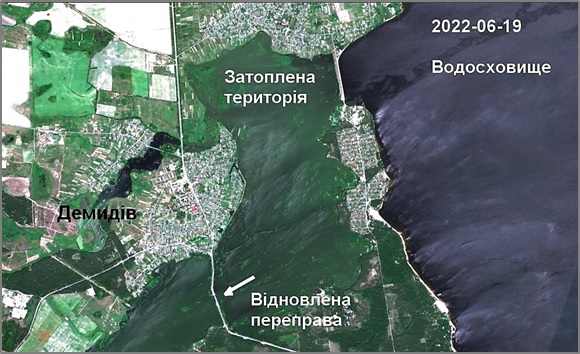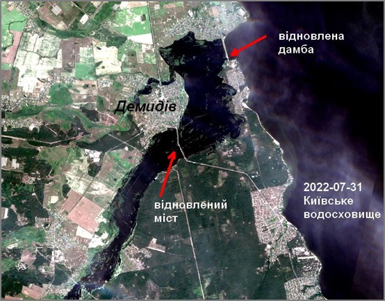 Обнадійлива інформація приходить останнім часом від Київської обласної військової адміністрації та Вишгородської райдержадміністрації щодо обстеження пошкодженої насосної станції й продовження робіт по захисту будівель Демидова від затоплення. Інфраструктура відновлюється, що добре видно на останньому космічному знімку за 31 липня 2022 р. (рис. 4). До початку серпня ситуація на підтоплених садибах і будівлях повинна покращитись, а усі інфраструктурні об'єкти відновлені.