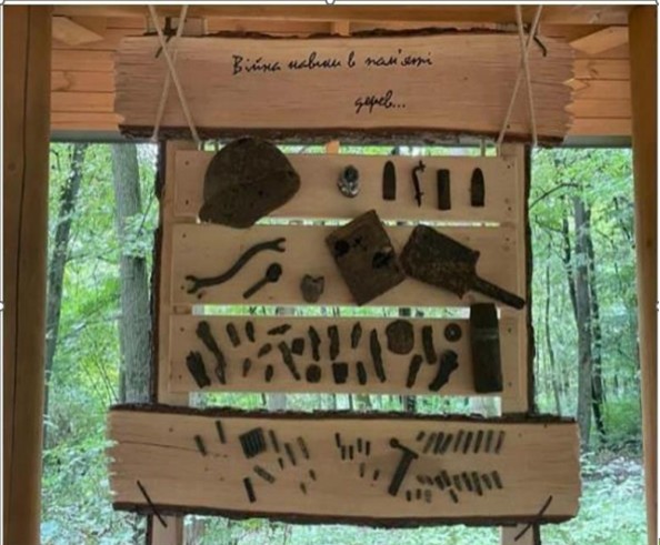 Ще однією цікавою локацією є альтанка Пам’яті. За словами працівників, кілька років тому вони втратили одне із найстаріших дерев саду. Тоді ж виникла ідея зробити з пенька вікового дерева стіл, а поруч облаштувати меморіальний стенд із залишками гільз та снарядів, знайдених на території Ботанічного саду після завершення ІІ Світової війни.
