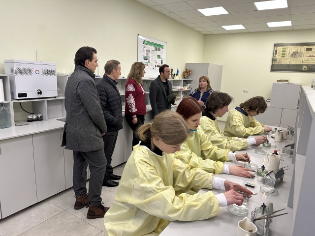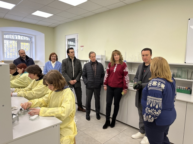 Декан факультету Юлія Коломієць, а також завідувачка кафедри екобіотехнології та біорізноманіття Олена Кваско радо зустріли гостей в лабораторії, де якраз проходило практичне заняття у студентів 3 курсу. Олена Юріївна окреслила основні напрямки діяльності та завдання лабораторії зазначивши, що ННЛ Біотехнології та клітинної інженерії є одночасно і практичною базою для навчання студентів, і основною лабораторією для проведення наукових досліджень. Лабораторія оснащена сучасними приладами й інструментами за якими студенти, аспіранти та співробітники університету мають можливість працювати і виконувати дослідження.