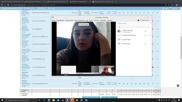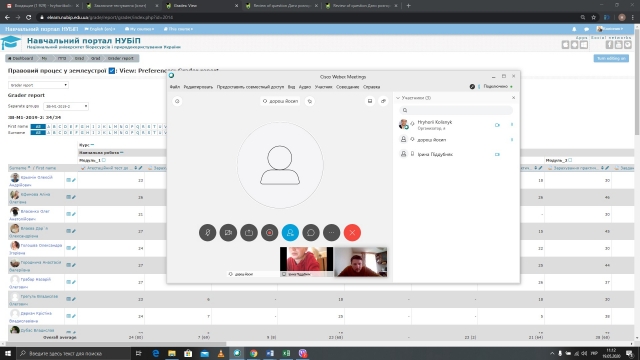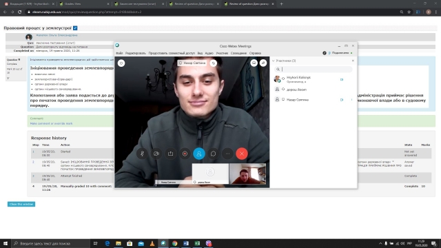За схожим сценарієм пройшов екзамен 19.05.2020 із «Правового процесу у землеустрої». Екзаменаторами були д.е.н. Дорош Й.М., який проводив лекційні заняття та к.е.н. Колісник Г.М. Студенти писали екзамен на атестованому навчальному курсі Навчально-інформаційного порталу НУБіП України, а співбесіди відбувались у CiscoWebex.