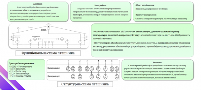 Ще однією важливою розробкою стала система дистанційного керування пташником, створена Валентином Домінським. У своїй роботі він успішно застосував сучасні мобільні комунікації для автоматизації управління промисловим пташником (науковий керівник – доцент Іван Цигульов).