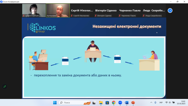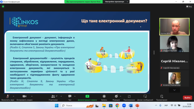 З метою ознайомлення зацікавлених студентів з питаннями електронного документообігу та захистом інформації за допомогою електронного підпису 25 жовтня 2023 року доцентом кафедри менеджменту ім. проф. Й. С. Завадського Оксаною Гавриш у межах діяльності студентського наукового гуртка «ДНК Лідера» була організована онлайн-зустріч з Артемом Кімом – представником ТОВ "М.Е.ДОК", членом команди розробників програмного забезпечення.