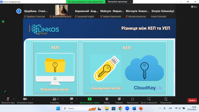 Артем Сергійович розповів гуртківцям та іншим присутнім різницю між КЕП та УЕП. Відмітив, що технологія роботи електронного підпису ґрунтується на відповідності пари ключів: секретного (особистого) та відкритого. Документ підписується електронним підписом за допомогою особистого ключа, який має тільки власник. Цьому секретному ключу відповідає відкритий ключ, за допомогою якого можна перевірити справжність підпису.