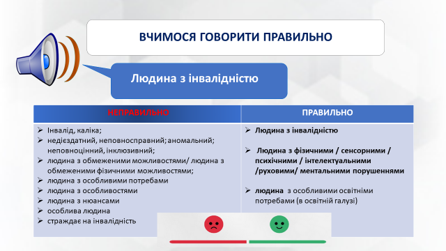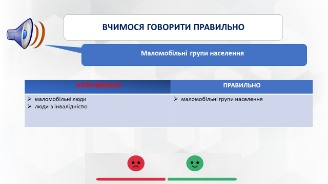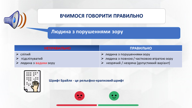 Люди з повною або частковими та значними порушенням зору для письма і читання використовують Шрифт Брайля – це рельєфно-крапковий тактильний шрифт. Користуватися ним можуть незрячі від народження та ті що втратили зір в дитячому, дорослому та старшому віці, а також люди з комплексними порушеннями слуху і зору. Жестова мова і рельєфно-крапковий тактильний шрифт – це засоби альтернативної та додаткової комунікації (АДК). За міжнародним визначенням цей термін позначає «розуміти і бути почутим» і може здійснюватися за допомогою жестів, міміки, зображень, фотографій, піктограм, технічних засобів тощо. Тому правильно говорити: «людина, яка спілкується за допомогою альтернативних засобів комунікації або людина, яка не говорить (не розмовляє)» Дуже часто, говорячи про інклюзію, безбар’єрність використовується вираз: «маломобільні люди і люди з інвалідністю». Коли ми використовуємо сполучник «і», ми ніби виокремлюємо дві групи, але люди з інвалідністю є частиною маломобільних груп населення. Тому правильно говорити: «маломобільні групи населення».