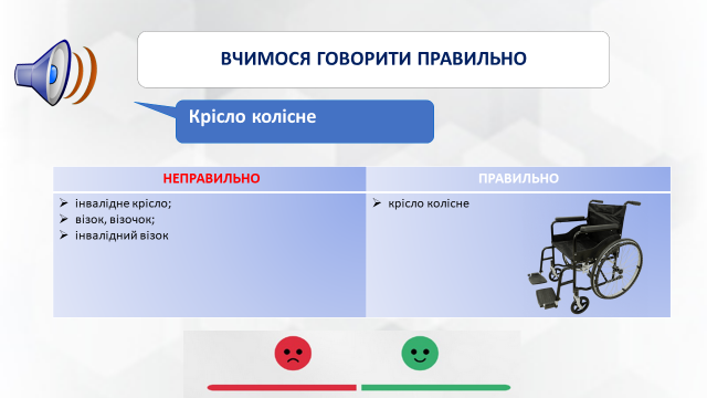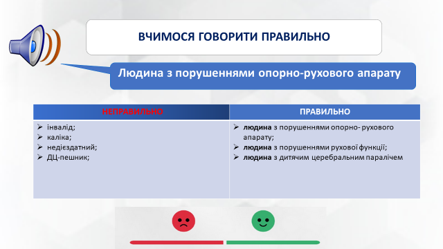 Якщо не знаєте, як сказати правильно, починайте фразу «людина з…», а далі зазначайте її риси чи стан здоров’я, якщо це потрібно. До речі, згідно із Законом України Про внесення змін до деяких законодавчих актів України (від 2017 р.), із усіх законодавчих актів вилучено терміни «інвалід», «особа з обмеженими фізичними можливостями», «інвалід війни» та «дитина-інвалід» у всіх відмінках і числах, запроваджуючи у вжиток такі терміни «особа з інвалідністю», «особа з інвалідністю внаслідок війни» та «дитина з інвалідністю». Якщо людина має розлад рухових функцій, то правильно називати: «людина з порушеннями опорно-рухового апарату», «людина з порушеннями рухової функції», «людина з дитячим церебральним паралічем». Неправильно – «інвалід», «каліка», «недієздатний», «ДЦ-пешник». Говорячи про людей, які мають порушення опорно-рухового апарату і користуються допоміжними засобами під час руху, варто зауважити на правильній назві – «крісло колісне». Тому в мовленні використовуємо вислови: «людина, яка користуються кріслом колісним», «людина, яка пересувається за допомогою крісла колісного», а не «візочник», «колясочник», «прикутий до інвалідного візка», «інвалід на інвалідному кріслі (візку)» тощо.