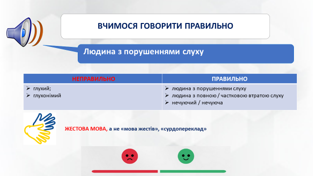 Тисячі нечуючих людей живуть повноцінним життям, отримують освіту та обирають професію, влаштовують особисте життя. Головне потрібно пам’ятати, що перед Вами – ЛЮДИНА, ОСОБИСТІСТЬ, тому правильно говорити: «людина з порушеннями слуху», «людина з повною / частковою втратою слуху», «нечуючий / нечуюча» Частина людей з порушенням слуху користується жестовою мовою. Якщо ми вживаємо вираз мова жестів, то насправді, цю мову використовує кожен з нас, коли щось пояснює, говорить, сміється та використовує жести й міміку. А от жестова мова – це мова, яку використовують люди з порушеннями слуху, у неї своя структура, правила та словник. Тому правильно говорити: «жестова мова», «переклад жестовою мовою». Неправильно – «мова жестів», а от термін «сурдопереклад» наразі вважається застарілим.