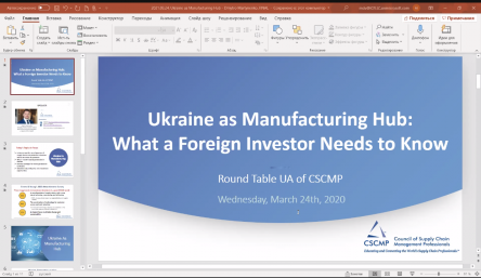 24 березня відбувся міжнародний вебінар «Україна як стратегічний виробничий хаб для глобальних ланцюгів постачань». Організатором заходу виступило представництво міжнародної асоціації Council of Supply Chain Management Professionals в Україні (www.cscmp.org CSCMP RT Ukraine). У роботі практичного заходу взяли участь викладачі кафедри менеджменту ім. проф. Й.С. Завадського: д.е.н., професор Надія Резнік та к.е.н., доцент Тетяна Артюх.