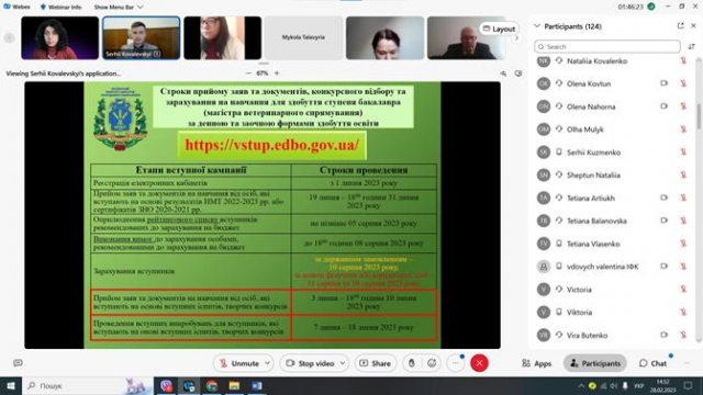 З умовами вступу в університет та процесом подачі заявок на вступ у 2023 році присутніх ознайомив відповідальний секретар приймальної комісії НУБіП України Сергій Ковалевський. Він відповів на всі питання вступників щодо конкурсного балу та обрання третього профільного предмету.