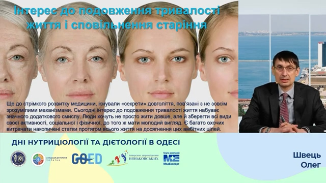 Зокрема Швець Олег Віталійович у своїй доповіді «Нутритивні інтервенції для сповільнення біологічного годинника» відмітитив, що нутритивні інтервенції мають потенціал для подовження тривалості життя і збереження високої функціональної спроможності. Обмеження калорій, ймовірно, є найбільш ефективною модифікацією дієти. Вживання алкоголю значно пришвидшує старіння, вкорочуючи довжину теломер, та збільшує ризик хвороб, асоційованих із віком. А обмеження надходження калорій та споживання макронутрієнтів може викликати мальнутрицію з негативними наслідками для здоров’я.