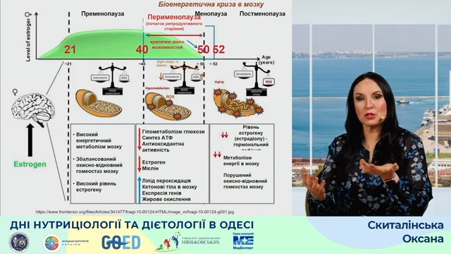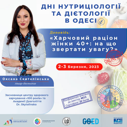 З доповіддю «Харчовий раціон жінки 40+: на що звернути увагу?» виcтупила засновниця Академії довголіття, віцепрезидент Асоціації дієтологів України, лікар-дієтолог Оксана Скиталінська. Вона зауважила, що вживати їжу слід приблизно в один і той самий час, обмежувати перекуси, перерва між вечерею та сніданком має бути не менше 13 годин, а сніданок повинен бути об’ємним.Їжа повинна бути збалансованою та різноманітною. Раціон харчування має містити клітковину, інулін, квашення. На зменшення запалення впливають омега-3-жирні кислоти, ягоди, какао, оливкова олія, зелень, горіхи. Цибуля, часник, перець, капуста, гранат, шпинат мінімізують ризик виникнення онкологічних патологій. Також варто обмежити споживання метіоніну та відмовитися від десертів, прохолодних напоїв і рафінованих страв. Корисні властивості правильного харчування мінімізуються при тривалому стресі, нераціональному сні та відсутності фізичних вправ. А при дотриманні усіх умов здорового способу життя та правильного харчування додається 5 років життя.