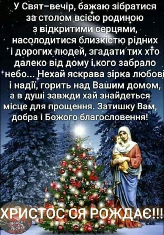 Ввечері 6 січня, коли у небі з'являється перша зірка, дружні українські родини збираються за одним столом, щоб зустріти Різдво разом. Знаходитись у чужому домі у цей важливий вечір не можна.