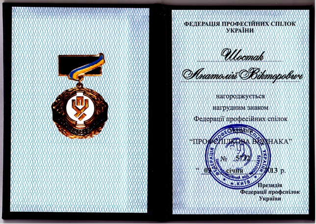 Федерація профспілок України нагородила Шостака А.В. нагрудним Знаком ФПУ «Профспілкова відзнака».