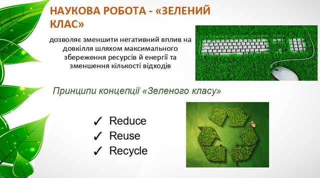 В доповіді старости гуртка було представлено власну наукову роботу «Зелений клас». Марія Чечко розповіла, що концепція «Зелений клас» дозволяє зменшити вплив на довкілля шляхом максимального збереження ресурсів й енергії та зменшення кількості відходів. Також, було зазначено, що дана концепція впроваджується на кафедрі стандартизації та сертифікації сільськогосподарської продукції в аудиторії 308 блоку Д, корпус 12. Органом до якого було подано заяву щодо сертифікації є Всеукраїнська громадська організація «Жива планета».