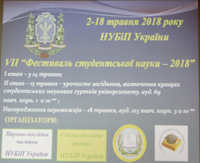 18 травня 2018 року до Всеукраїнського Дня науки відбулося оголошення результатів та переможців VII «Фестивалю студентської науки – 2018». Відкрив цей святковий день вітальним словом ректор Національного університету біоресурсів і природокористування України Станіслав Ніколаєнко.