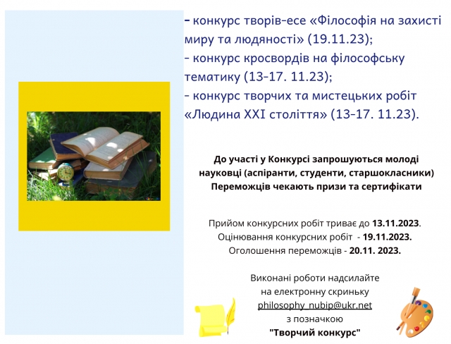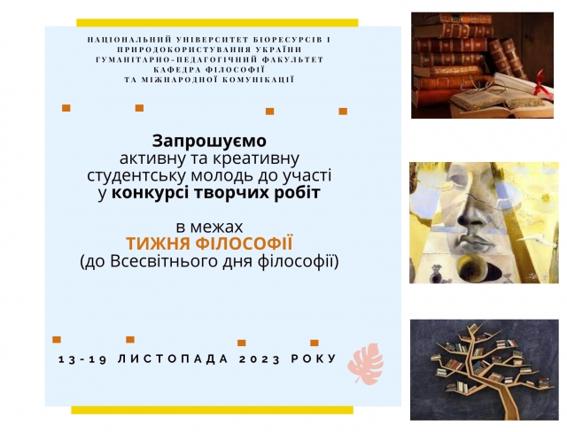 В рамках проведення "Тижня філософії" до Всесвітнього дня філософії викладачі кафедри філософії та міжнародної комунікації провели конкурс творчих студентських робіт серед студентів усіх факультетів НУБіП України, зокрема, відбулись конкурси з написання есе «Філософія на захисті миру та людяності», конкурс кросвордів на філософську тематику, конкурс творчих та мистецьких робіт "Людина XXI ст". Це унікальна можливість для кожної творчої особистості висловити свої ідеї, переконання та власний погляд на філософські аспекти життя через різноманітні творчі форми. Конкурси продемонстрували високий рівень інтелектуальної та творчої активності учасників, а також важливість застосування філософського підходу до вирішення глобальних викликів.