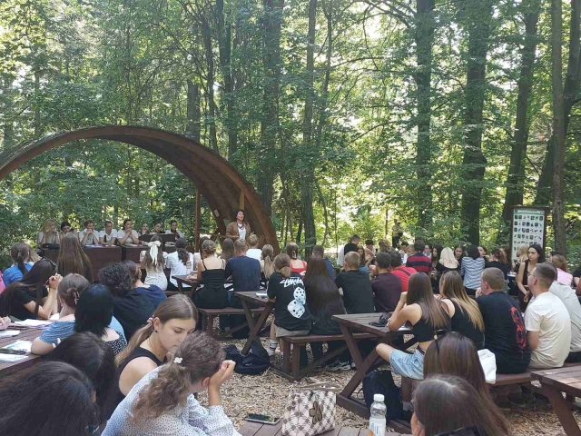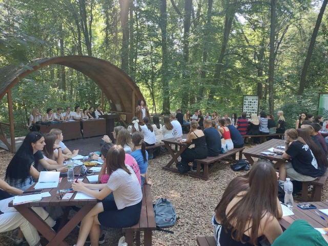 На шпальті календаря у розпалі осінь, а за вікнами корпусів НУБіП України– справжнє літо. П’янкий аромат троянд і ялинової хвої, пишна зелень Ботанічного саду НУБіП України надихають на зрозуміле бажання провести заняття у екокласі. Так, саме там – у екокласі проводила відкриту лекцію декан гуманітарно-педагогічного факультету і доцент кафедри філософії та міжнародної комунікації Інна Савицька. Очевидно, викладачі філософії з інших вишів можуть тільки мріяти про таку нагоду: серед розкішної природи, просто неба залучати студентів до глибин філософської мудрості.