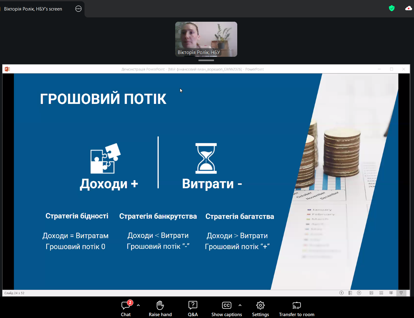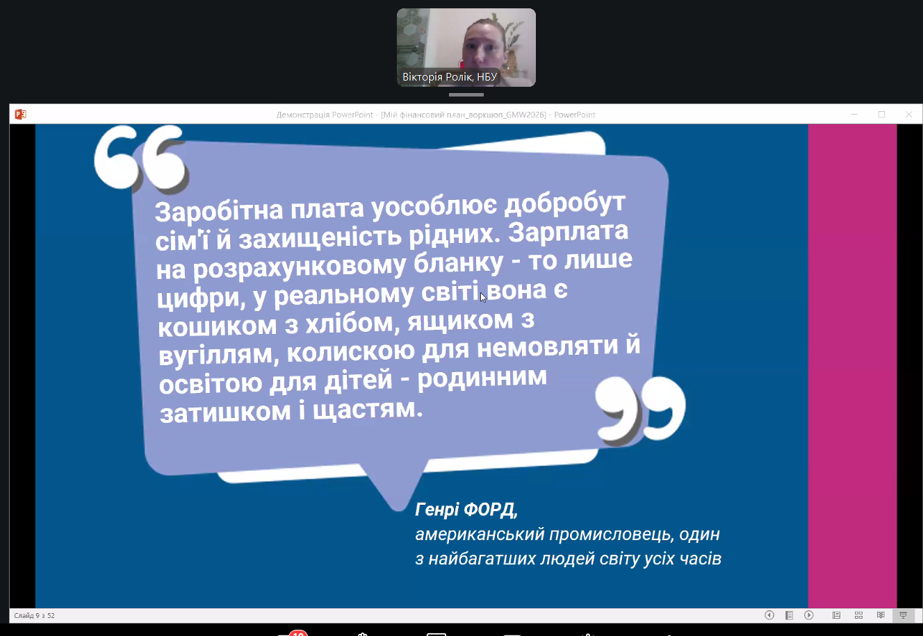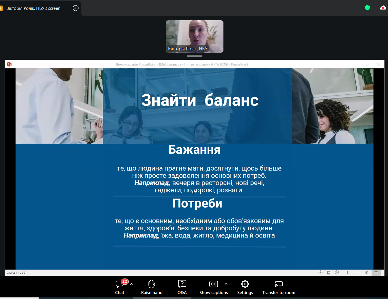 Зустріч відбулась у ZOOM. Спікеркою заходу виступила Вікторія РОЛІК — керівниця Центру фінансових знань «ТАЛАН» Національного банку України. Освітні ініціативи Центру фінансових знань «ТАЛАН» відіграють важливу роль у популяризації фінансової освіти та розвитку практичних компетентностей, необхідних для прийняття обґрунтованих фінансових рішень у сучасному економічному середовищі.