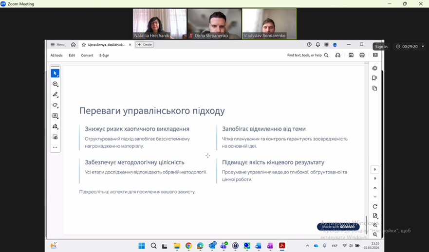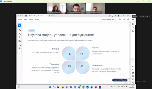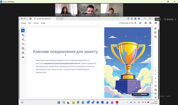 Не менш важливим етапом є підсумкова рефлексія: магістранти аналізують результати своєї роботи, оцінюють досягнення й труднощі, узагальнюють отриманий досвід у звіті та презентують його під час захисту. Це дозволяє не лише зафіксувати результати, а й усвідомити власне зростання як дослідника.