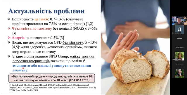З доповіддю виступив Олександр Аркадійович Мартинчук, кандидат медичних наук, доцент, дієтолог і гастроентеролог, який представив системний огляд сучасного підходу до практичного застосування безглютенової дієти (БГД) з позицій доказовості, харчової безпеки та нутритивної підтримки людей.