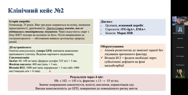 Особливий акцент було зроблено на ролі нутриціолога як ключової ланки у довготривалому супроводі пацієнтів із целіакією, включно з корекцією нутрієнтних дефіцитів, побудовою збалансованого меню та психоемоційною підтримкою.