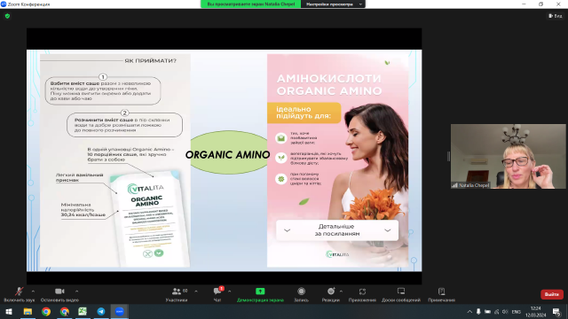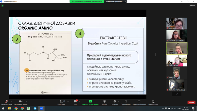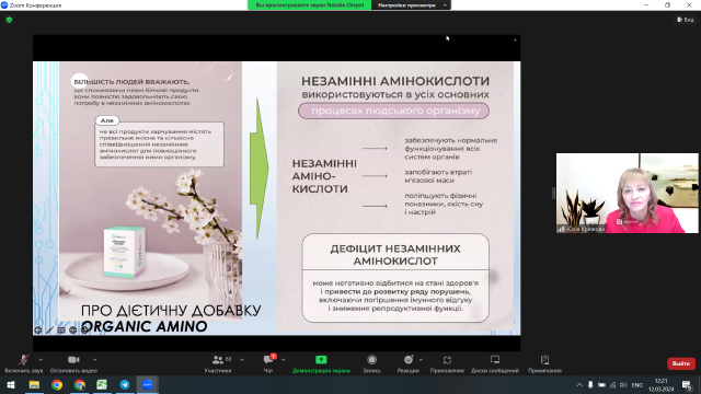 Була охарактеризована дієтична добавка ORGANIC AMINO VITALITA, розроблена лектором, яка рекомендується для нормалізації гормонального балансу завдяки комплексу амінокислот, відповідає амінокислотному профілю ідеального білка ФАО/ВООЗ, нормалізує гомеостаз, підтримує та збільшує м’язову масу. Незамінні амінокислоти використовуються в усіх основних процесах людського організму: забезпечують нормальне функціонування всіх систем органів, запобігають втраті м’язової маси, поліпшують фізичні показники, якість сну і настрій. Їх дефіцит може привести до погіршення імунного відгуку і зниження репродуктивної функції.