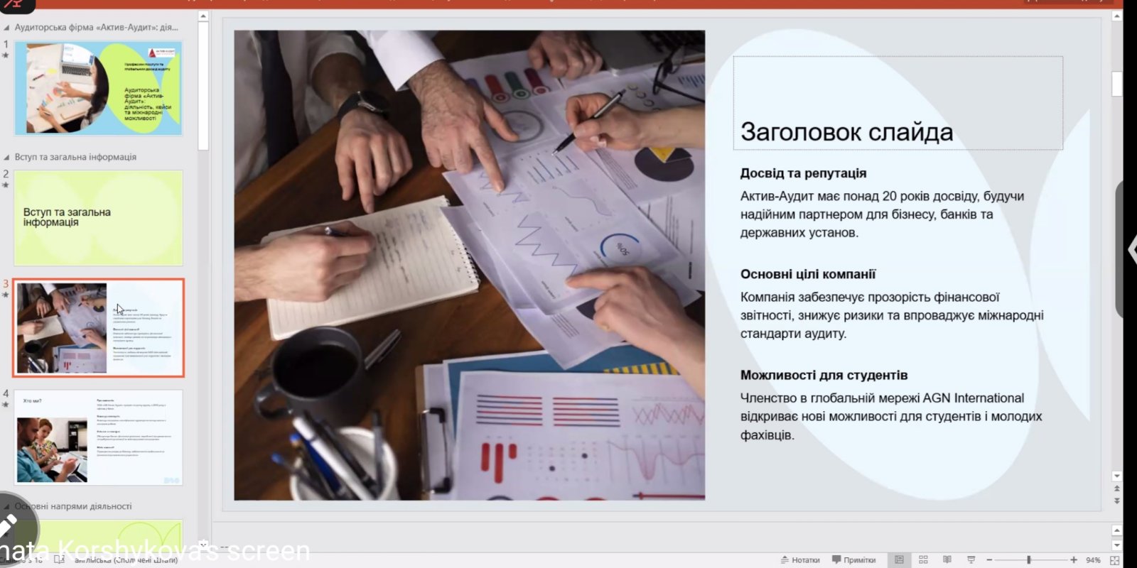 У продовження зустрічі було представлено діяльність компанії «Актив-аудит», яка має понад 20 років досвіду та є надійним партнером для бізнесу, банківських установ і державного сектору. Компанія забезпечує прозорість фінансової звітності, сприяє зниженню ризиків і впроваджує міжнародні стандарти аудиту у практичну діяльність підприємств. Членство в глобальній мережі AGN International відкриває додаткові професійні можливості для здобувачів вищої освіти та молодих фахівців.