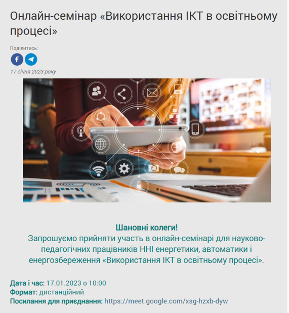 З метою удосконалення своїх вмінь та обміну досвідом в ННІ енергетики, автоматики і енергозбереження за ініціативи дирекції організовано та проведено онлайн-семінар «Використання ІКТ в освітньому процесі». В програмі семінару було передбачено декілька доповідей, які розкривали практичні особливості створення навчального контенту інженерних дисциплін насамперед для дистанційної форми навчання.