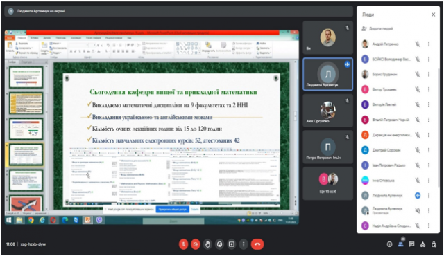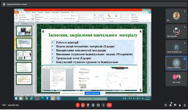 Доцент кафедри вищої та прикладної математики Людмила Артемчук звернула увагу на окремі методичні аспекти вивчення вищої математики в форматі змішаного навчання. Акцентувала увагу на методах та засобах ефективного представлення матеріалу та комунікації з студентами під час олайн-заняття.