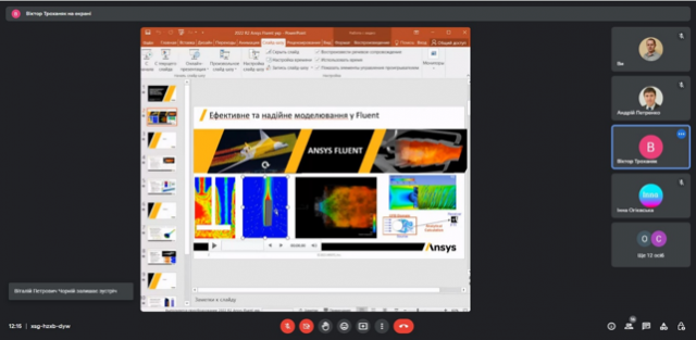 Доцент кафедри теплоенергетики Віктор Троханяк у своєму виступі познайомив присутніх з використанням спеціалізованого програмного продукту Ansys Fluent при вивченні дисципліни "Моделювання процесів переносу і гідродинаміки" в умовах змішаної форми навчання студентів-теплоенергетиків. Учасникам семінару було цікаво ознайомитися з можливостями даного програмного продукту та його використання не лише в навчальній, а і науковій роботі студентів.