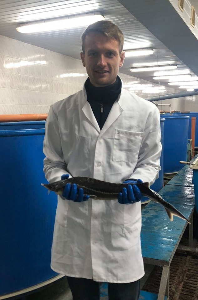 Фото 1. Студент 3 курсу факультету тваринництва та водних біоресурсів Сергій Кайстро з плідником стерляді