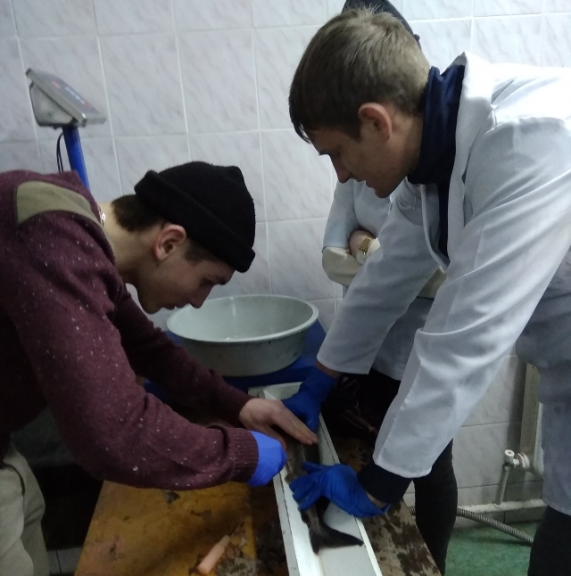 Фото 3. Студенти Станіслав Крайніков (на фото - ліворуч) і Сергій Кайстро беруть біопсійну пробу гонад у риби