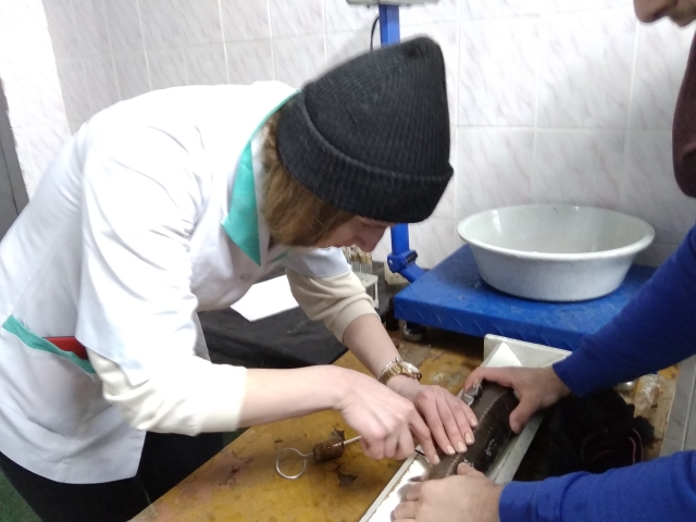 Фото 4. Мар’яна Гаврилюк відбирає пробу гонад у самиці стерляді