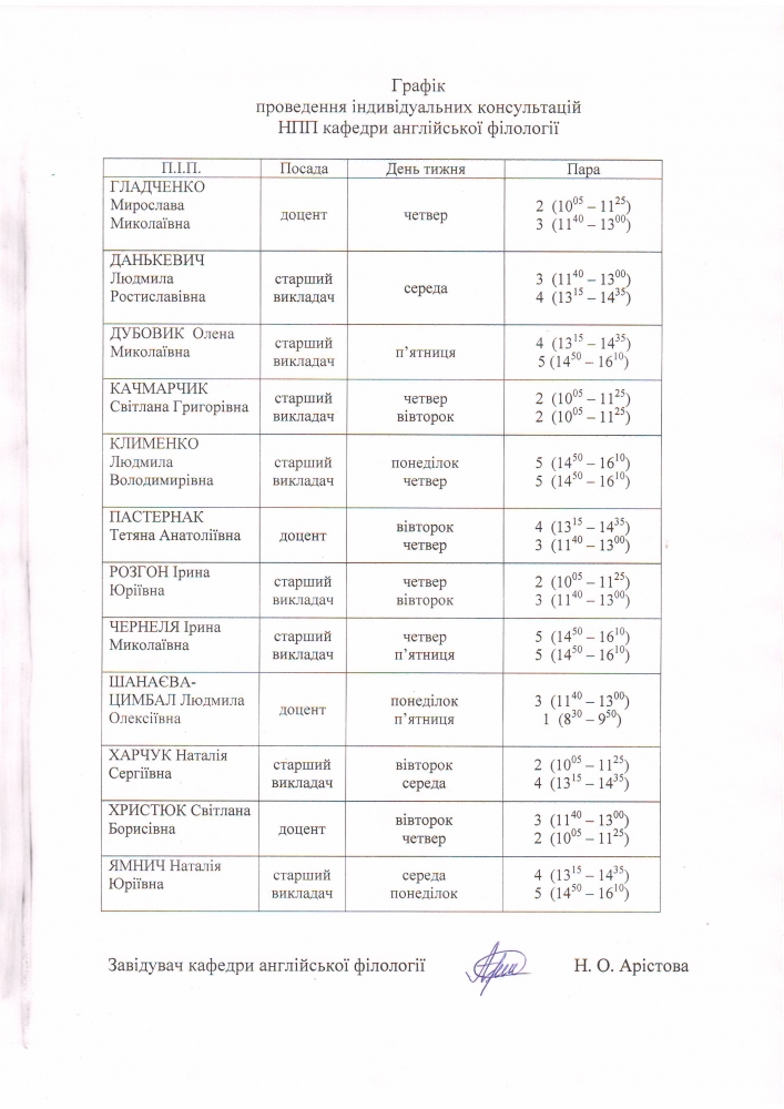 Графік проведення індивідуальних консультацій НПП кафедри зі студентами на I семестр 2018 - 2019 навчальний рік Графік проведення індивідуальних консультацій зі студентами вт, 2 жов 2018 - 03:00