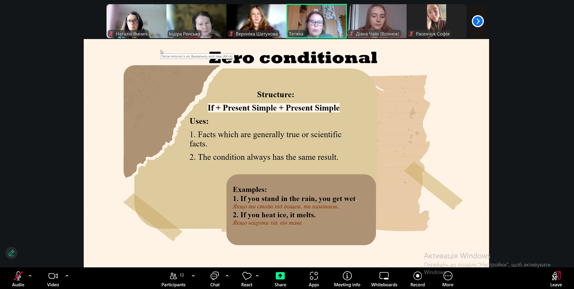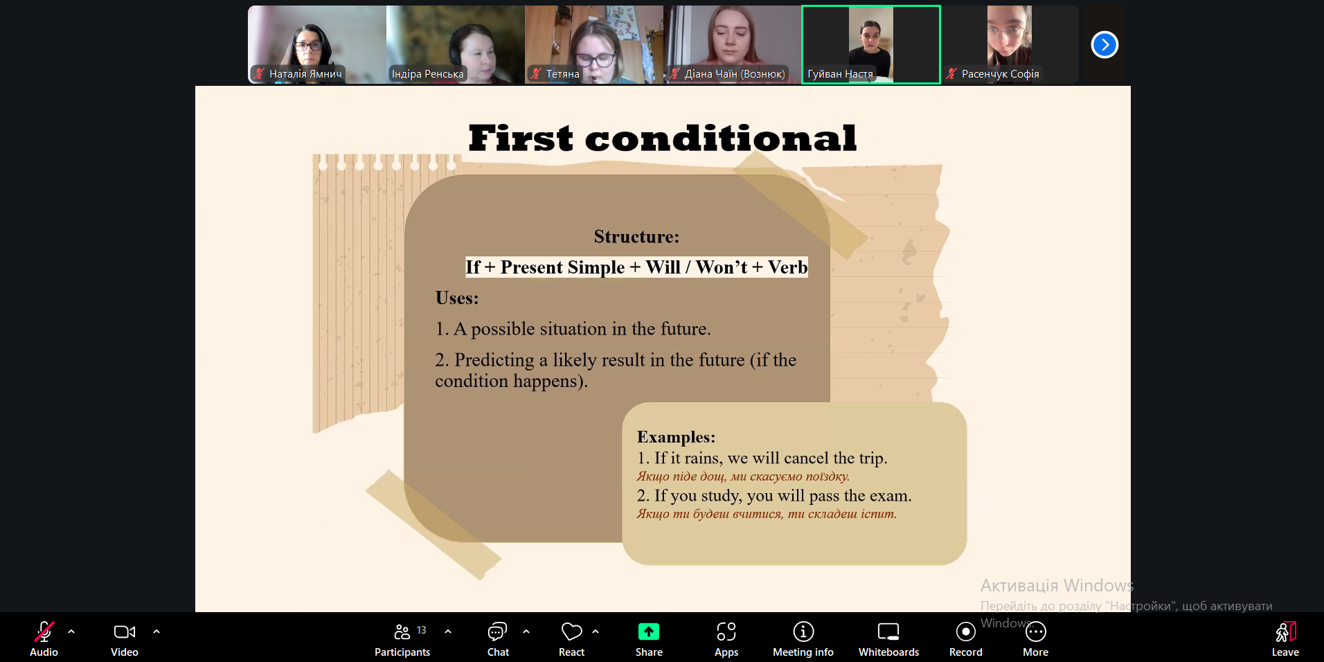 Під час заняття студенти повторили та узагальнили граматичну тему умовних речень в англійській мові. На початку викладач коротко окреслила основні типи conditional sentences, після чого студенти представили підготовлені повідомлення про кожен тип умовних речень (0, 1, 2 та 3). Після кожного виступу викладач коментувала відповіді студентів, узагальнювала основні положення та ставила запитання до всієї групи для перевірки розуміння матеріалу. Після презентацій студенти виконали граматичні вправи для закріплення теми. Викладач коректно й професійно коментувала відповіді, звертаючи увагу на типові помилки та допомагаючи студентам їх виправити.