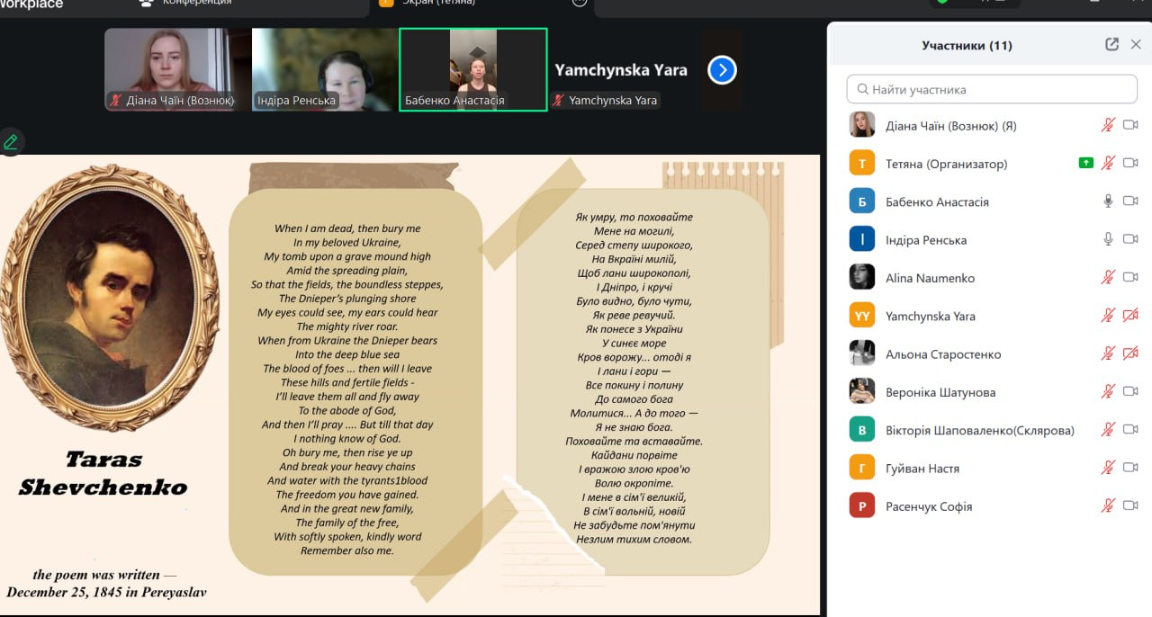 Третя частина заняття була присвячена творчості Тараса ШЕВЧЕНКА, день народження якого традиційно відзначається у березні. Викладач вдало провела своєрідний місток між британською та українською літературою, підкресливши універсальність цінностей, які порушують митці у своїх творах.