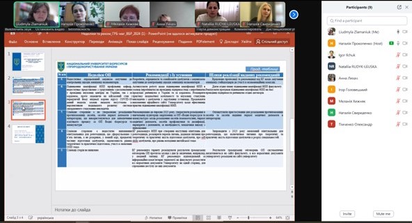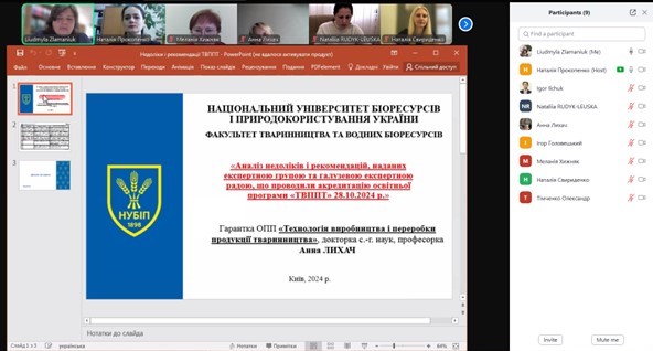 Гаранти освітніх програм – д.с.-г.н., професор Анна Лихач, гарант ОПП «Технологія виробництва і переробки продукції тваринництва» ОС «Магістр», д.б.н., доцент Наталія Рудик-Леуська, гарант ОПП «Водні біоресурси та аквакультура» ОС «Магістр» – представили членам НМР результати детального аналізу результатів акредитаційних експертиз, які були проведені членами проектних груп, груп забезпечення спеціальності, адміністрацією факультету.
