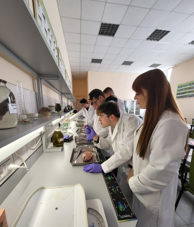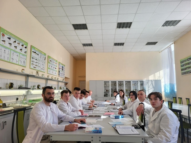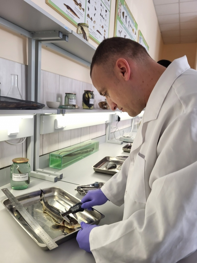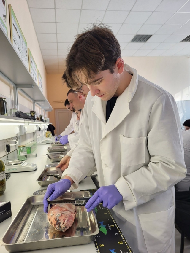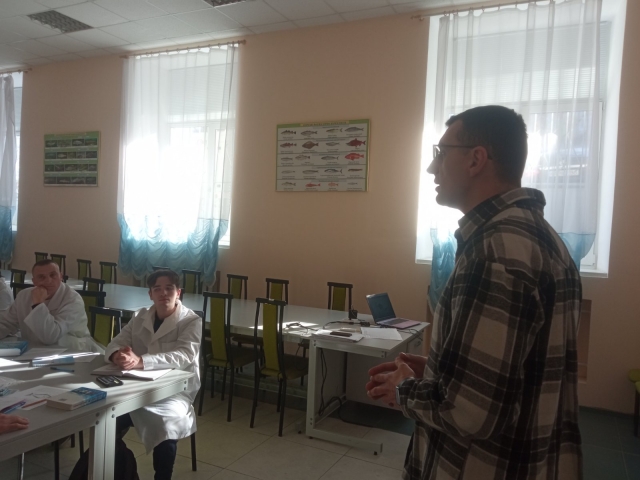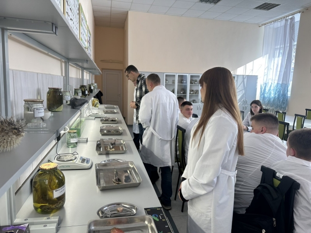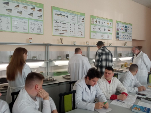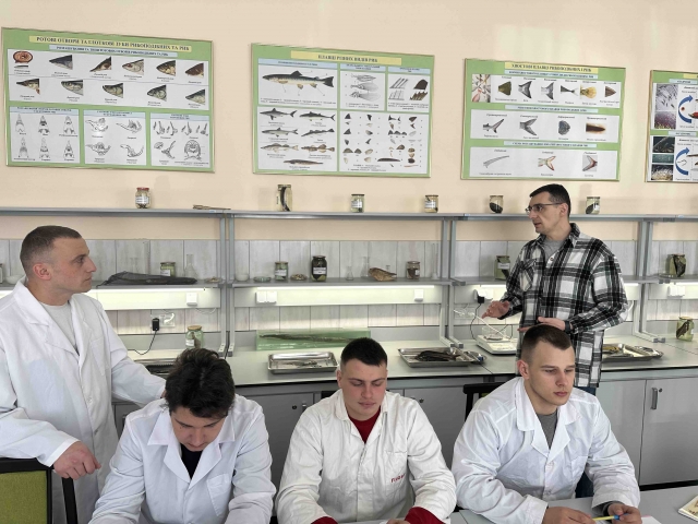 Візит продовжився відвідуванням лабораторного заняття з дисципліни «Іхтіологія (спеціальна)» для здобувачів першого (бакалаврського) рівня вищої освіти зі спеціальності Н5 «Водні біоресурси та аквакультура», із теми: «Визначення видів та проведення повного морфометричного аналізу риб». Заняття проводили доценти кафедри гідробіології та іхтіології Петро Григорович Шевченко та Аліна Анатоліївна Макаренко. Здобувачі вищої освіти продемонстрували високий рівень володіння знаннями щодо гуманного ставлення до гідробіонтів під час проведення виробничих та дослідних маніпуляцій, розуміння терміну – «біль», методи знеболення риб, груп анестетиків та способів їх застосування. На занятті здобувачі вчилися правильно визначати види риб за ознаками їх зовнішньої будови, а також проводити повний морфометричний аналіз для вивчення впливу умов середовища на їх життєздатність. В якості наочного матеріалу було використано дефростовані зразки осетрових, камбалових та цихлових риб. Під час проведення морфометричного аналізу риб здобувачі використовували сучасне лабораторне обладнання.