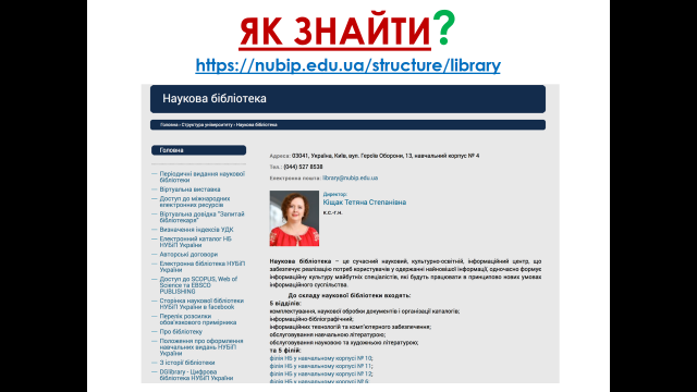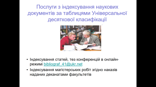 Юні науковці обов’язково повинні вміти користуватися науковою бібліотекою. Віталій Леонідович зазначив: «Знання в книжці. Книжка в бібліотеці. Бібліотека в 4-му корпусі». Та запросив до слова завідувача відділу науковою бібліотекою Людмилу Артюх. Вона представила останні публікації кафедри. Надала коротку інформацію про бібліотеку: де знаходиться бібліотека, як можна отримати УДК в дистанційному режимі та інш.