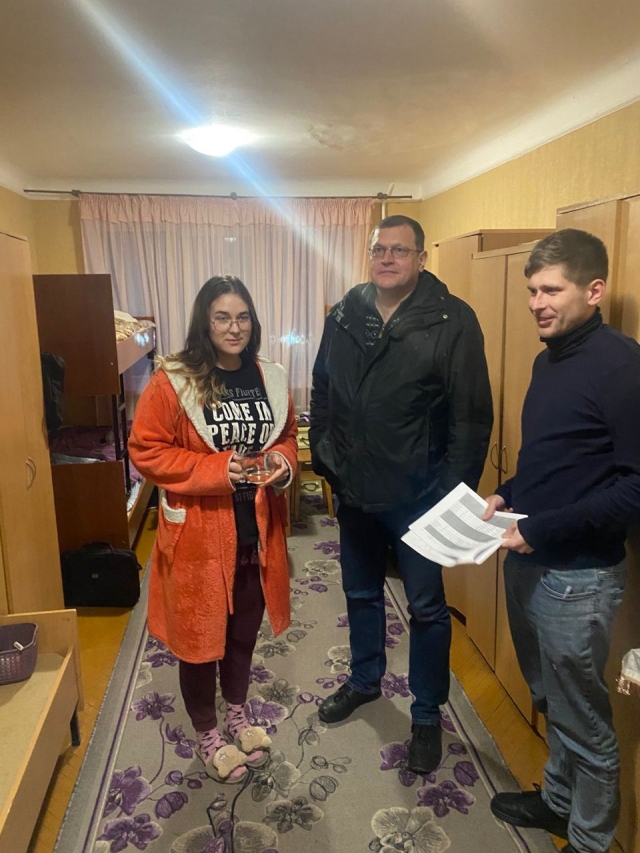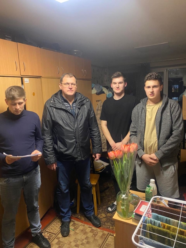 З початком очного навчання Віталій Коваленко та Олександр Гаврилюк 7 березня планово відвідали 8-й гуртожиток, оглянули якість проживання студентів, поспілкувалися з ними щодо наявних проблем, які необхідно вирішити, а також попередньо обговорили можливий план робіт по підготовці вільних кімнат до поселення першокурсників 2023 року.