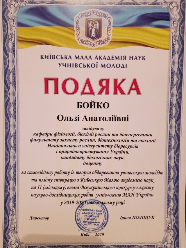 13 – 14 лютого 2021 року на базі Київської Малої Академії Наук учнівської молоді проходив ІІ етап Конкурсу-захисту науково-дослідних робіт серед учнів 8-11 класів. У роботі журі щороку приймає участь кандидат біологічних наук, доцент кафедри фізіології, біохімії рослин та біоенергетики Бойко Ольга Анатоліївна, яка разом з колегами нашого університету оцінювала роботи у галузі екології та аграрних наук.