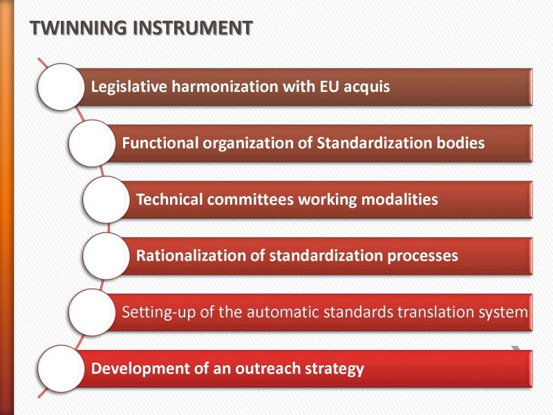 Цікавим був той факт, що з 29.10.2018 по 28.10.2020 р. з Національним органом стандартизації запускається проект Twinning. Twinning – це інструмент інституційного будівництва, форма прямої технічної співпраці між центральними органами виконавчої влади країни, що виступають бенефіціарами цього виду зовнішньої допомоги ЄС, та органами влади країн-членів Європейського Союзу. Twinning має на меті допомагати країнам-бенефіціарам у розбудові сучасних і ефективних органів центральної та місцевої влади, структури, людських ресурсів та управлінського потенціалу яких дозволяли б впроваджувати законодавство ЄС (acquis communautaire) на рівні стандартів, прийнятих у країнах-членах ЄС.