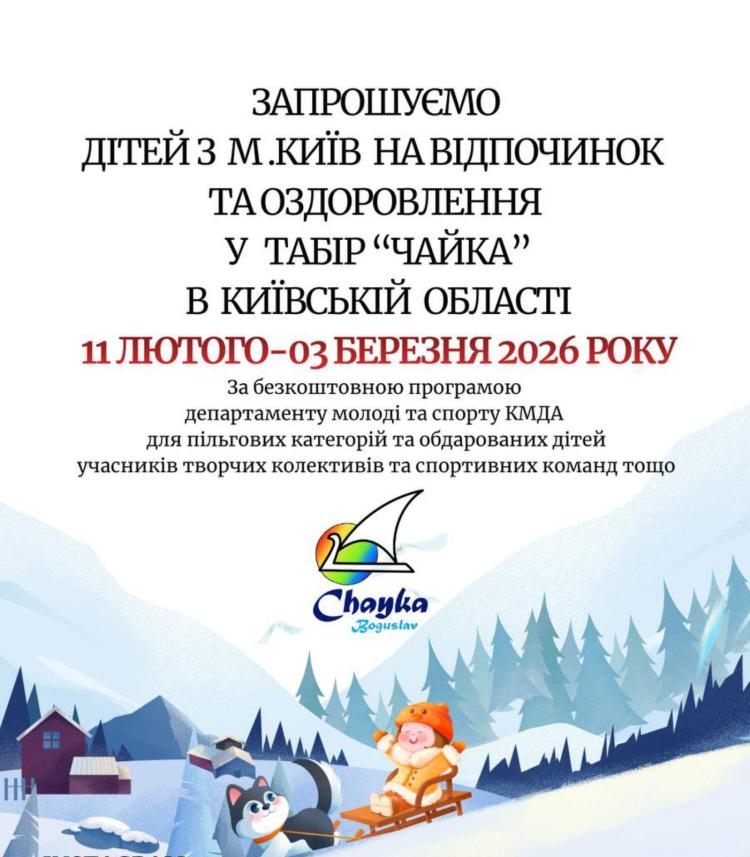 до оздоровчого табору ДОЗ СТ «Чайка» з 11 лютого 2026 року до 3 березня 2026 року для дітей пільгових категорій віком від 7 до 17 років, які зареєстровані або навчаються в місті Києві