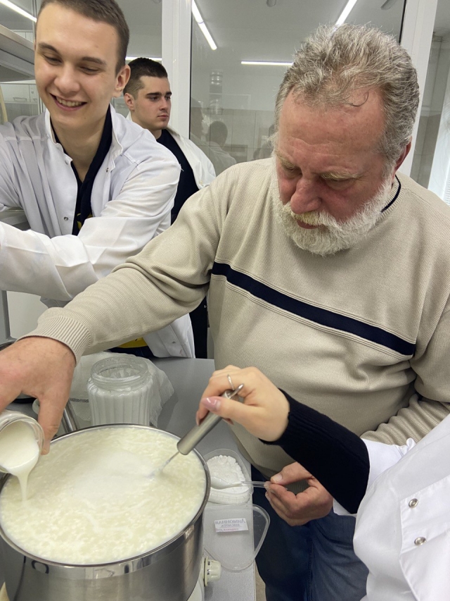 Адигейський сир - сироватковий сир, що належить до групи м’яких сирів без дозрівання. Він родич бринзи, фети, моцарели, рікоти, маскарпоне, але, на відміну від своїх побратимів, проходить пастеризацію за високої температури. Технологія виготовлення проста і не займає багато часу. Студенти разом з викладачами доцентами Галиною Толок та Олександром Савченком провели майстер-клас з приготування Адигейського сиру.