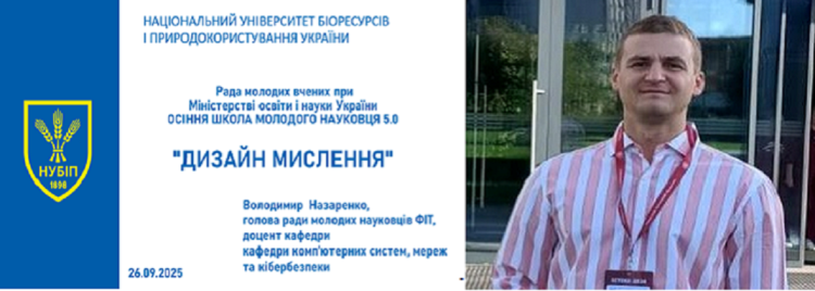 26 вересня 2025 р. на засіданні «ОСІННЬОЇ ШКОЛИ МОЛОДОГО НАУКОВЦЯ 5.0» Ради молодих вчених при Міністерстві освіти і науки України інтерактив на тему «ДИЗАЙН МИСЛЕННЯ» для молодих науковців України провів Володимир НАЗАРЕНКО, голова ради молодих вчених факультету інформаційних технологій НУБіП України, доцент кафедри комп'ютерних систем, мереж та кібербезпеки.