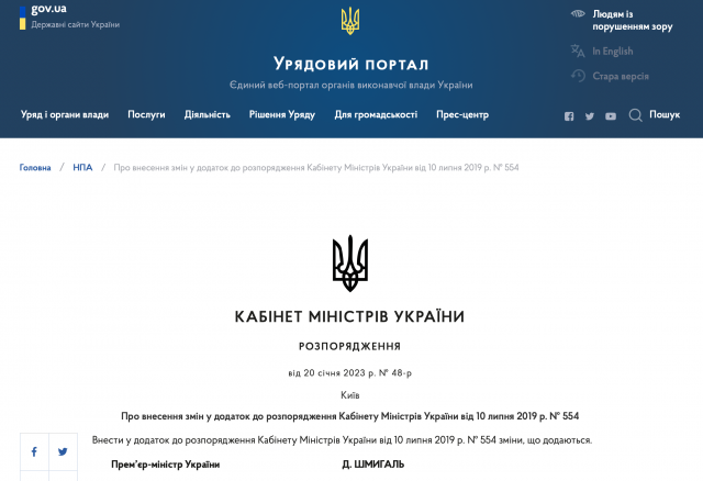 Розпорядженням Кабінету Міністрів України від 20 січня 2023 р. №48-р внесено зміни до додатку до Розпорядження Кабінету Міністрів України від 10 липня 2019 р. № 554, яким визначено Перелік іноземних акредитаційних агентств та агентств із забезпечення якості вищої освіти, які видають сертифікати про акредитацію освітніх програм, що визнаються в Україні.