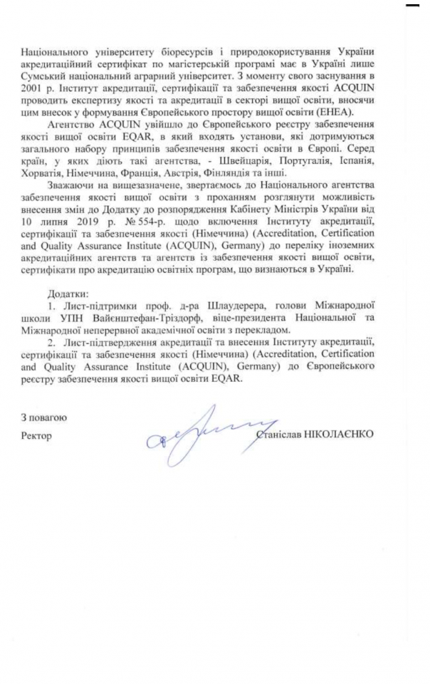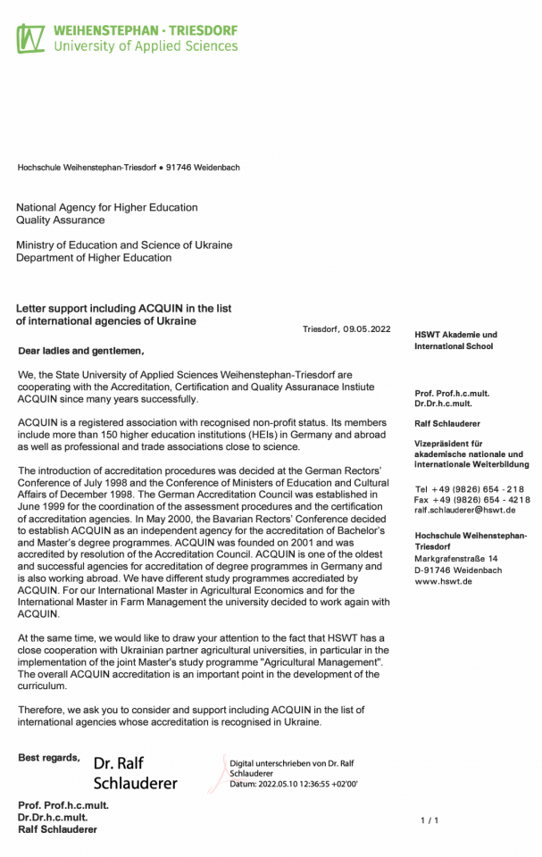 Також для підтримки інтеграції ACQUIN до Переліку сертифікованих агенцій було надіслано лист підтримки від нашого партнера - Університету прикладних наук Вайєнштефан-Трісдорф за підписом віце-президента Ральфа Шлаудерера.