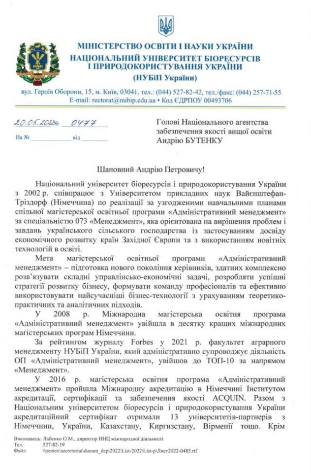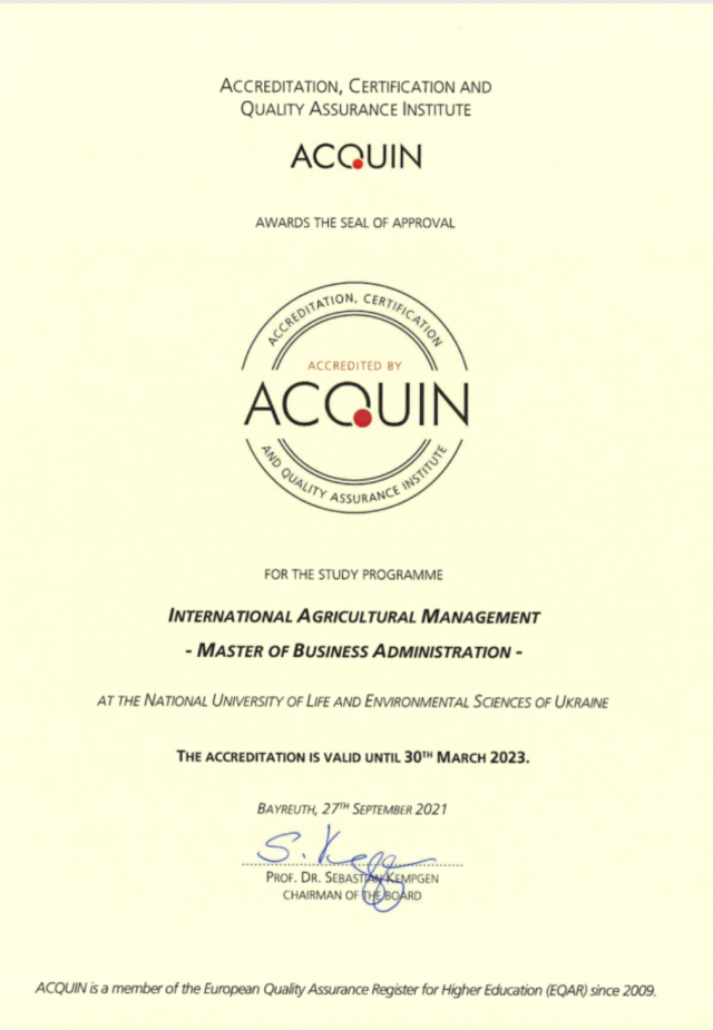 Отримана акредитація підтверджує відповідність навчального плану до аналогічних програм в Європі, високу якість викладання в НУБіП України на магістерській ОП «Адміністративний менеджмент» та дає можливість студентам, які за нею навчаються, отримати подвійні дипломи НУБіП та Університету прикладних наук Вайєнштефан-Тріздорф (Німеччина).