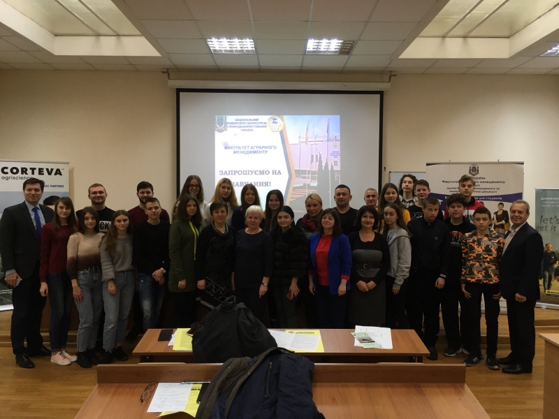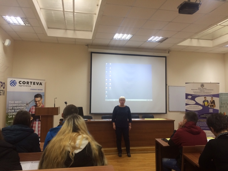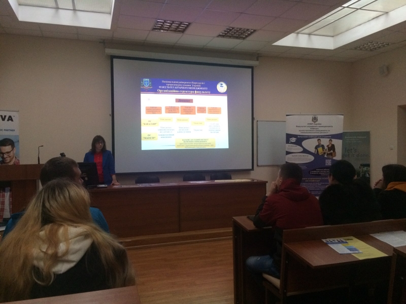 Заступник декана Лариса Карпенко презентувала аудиторії здобутки факультету аграрного менеджменту: узгоджені з вимогами ринку праці навчальні плани, міжнародну мобільність студентів і викладачів, можливість проходження виробничої практики на кращих вітчизняних і закордонних підприємствах, матеріальну базу, умови для відпочинку та спорту.