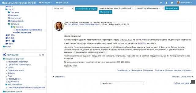 З перших днів карантину в курсі «Зоологія» в ресурсі «Новини» були подані основні роз’яснення щодо особливостей навчального процесу під час карантину, узгоджений план роботи по дисципліні, також були створені Viber-групи з дисципліни.