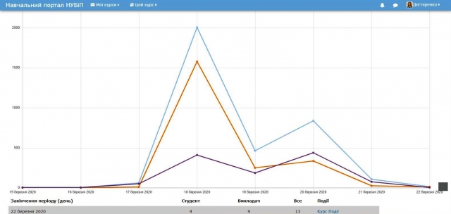 Аналізуючи статистику відвідувань курсу студентами за минулий тиждень можна сказати, що студенти активно працюють над завданнями, вчасно відправляють на перевірку виконані лабораторні роботи. За розкладом навчальних занять, 18 березня були проведені занятті, саме в цей день спостерігалась найбільша активність на курсі.